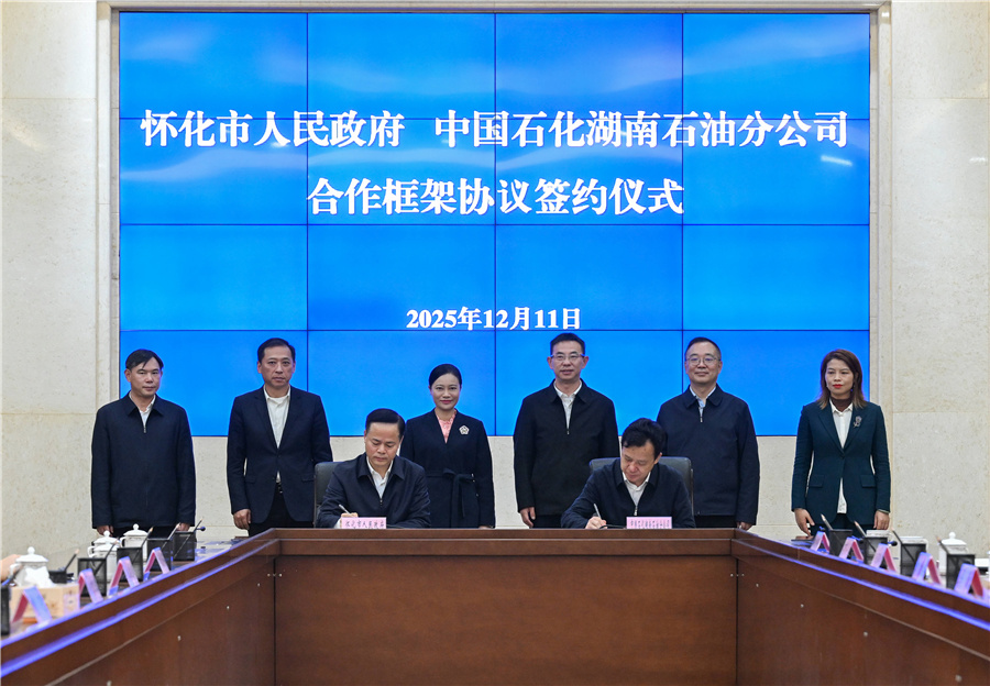 (12月11日下午,市政府與中國石化湖南石油分公司簽署合作框架協(xié)議。懷化日報全媒體記者 吳濤 攝)