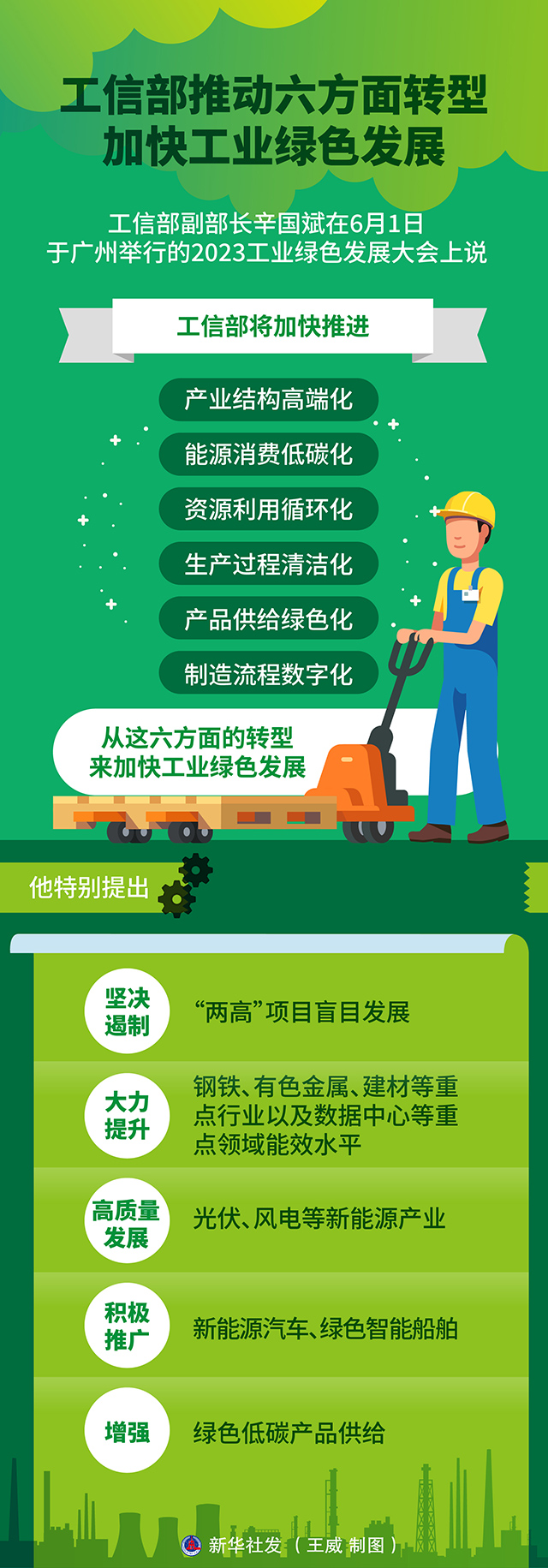 工信部副部長(zhǎng)辛國(guó)斌在6月1日于廣州舉行的2023工業(yè)綠色發(fā)展大會(huì)上說(shuō),要通過(guò)加快推進(jìn)產(chǎn)業(yè)結(jié)構(gòu)高端化、能源消費(fèi)低碳化、資源利用循環(huán)化、生產(chǎn)過(guò)程清潔化等六方面轉(zhuǎn)型,全面推進(jìn)工業(yè)綠色發(fā)展,將工業(yè)綠色發(fā)展作為新型工業(yè)化的重點(diǎn),打造綠色新動(dòng)能。