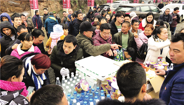 1月28日,洪江市組織工作人員在邵懷高速公路安江出口為被困乘客免費(fèi)發(fā)放餅干、方便面和飲用水等食品。由于嚴(yán)寒低溫天氣,邵懷高速洪江市路段大面積結(jié)冰,安江出口20 余輛大巴車被困。該市立即調(diào)撥救援物資,幫助被困群眾。(楊錫建 向華 攝)