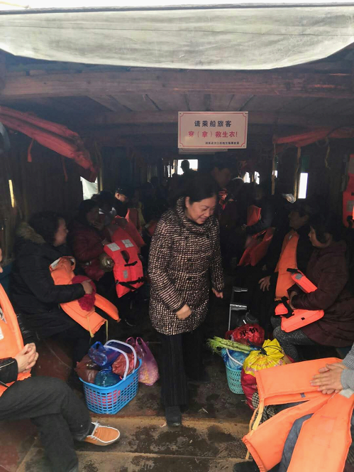 春運(yùn)辦副組長胡香蓮督促乘客穿(拿)救生衣