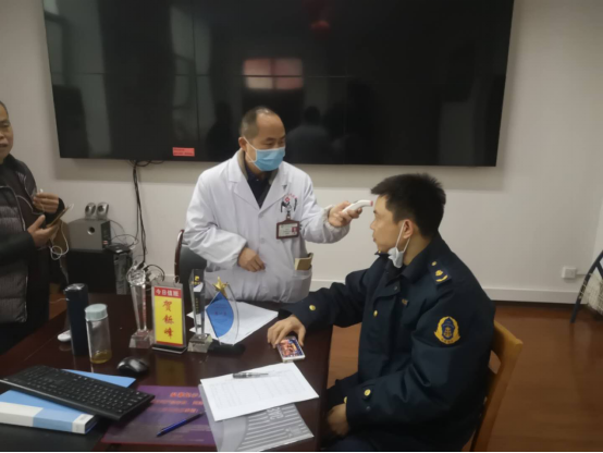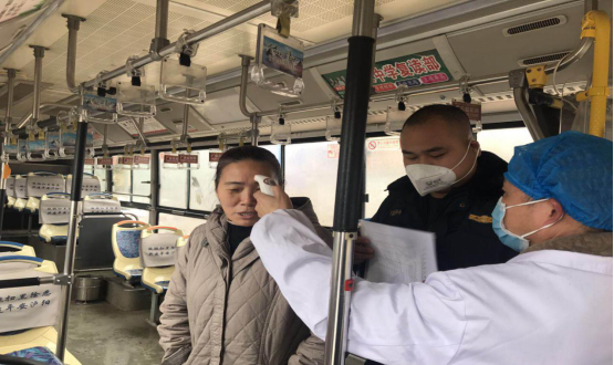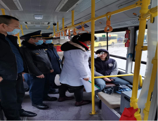 圖一:執(zhí)法人員與衛(wèi)健部門對(duì)公交乘客測(cè)體溫