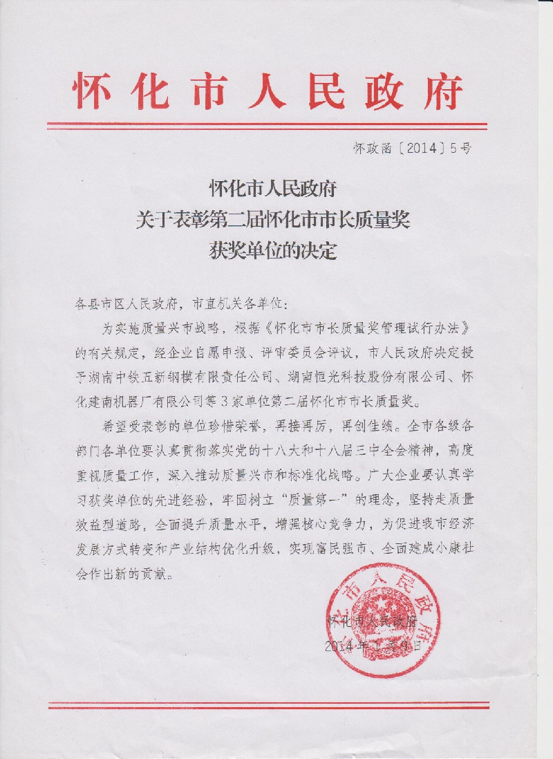 自2011年頒發(fā)首屆懷化市市長質(zhì)量獎以來,全市各級各部門,各企業(yè)迅速掀起了質(zhì)量興市熱潮,廣泛開展了學習貫徹落實以《卓越績效評審準則》國家標準和市內(nèi)外先進企業(yè)成功質(zhì)量管理經(jīng)驗為重點的質(zhì)量強市活動,我市質(zhì)量工作得到了很好的發(fā)展,為進一步推進質(zhì)量興市戰(zhàn)略,2013年我市根據(jù)《懷化市市長質(zhì)量獎試行管理辦法》的有關(guān)規(guī)定,經(jīng)企業(yè)自愿申報、評審委員會評議,市人民政府決定,授予湖南中鐵五新鋼模有限責任公司、湖南恒光科技股份有限公司、懷化建南機器廠有限公司等3家單位第二屆懷化市市長質(zhì)量獎。