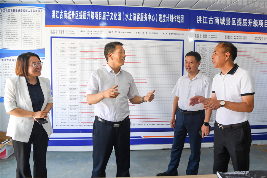 (許忠建在洪江古商城了解屈子江閣、水上游客服務中心等景區(qū)提質改造項目進展情況。以上照片均由懷化日報全媒體記者 楊智偉 攝)