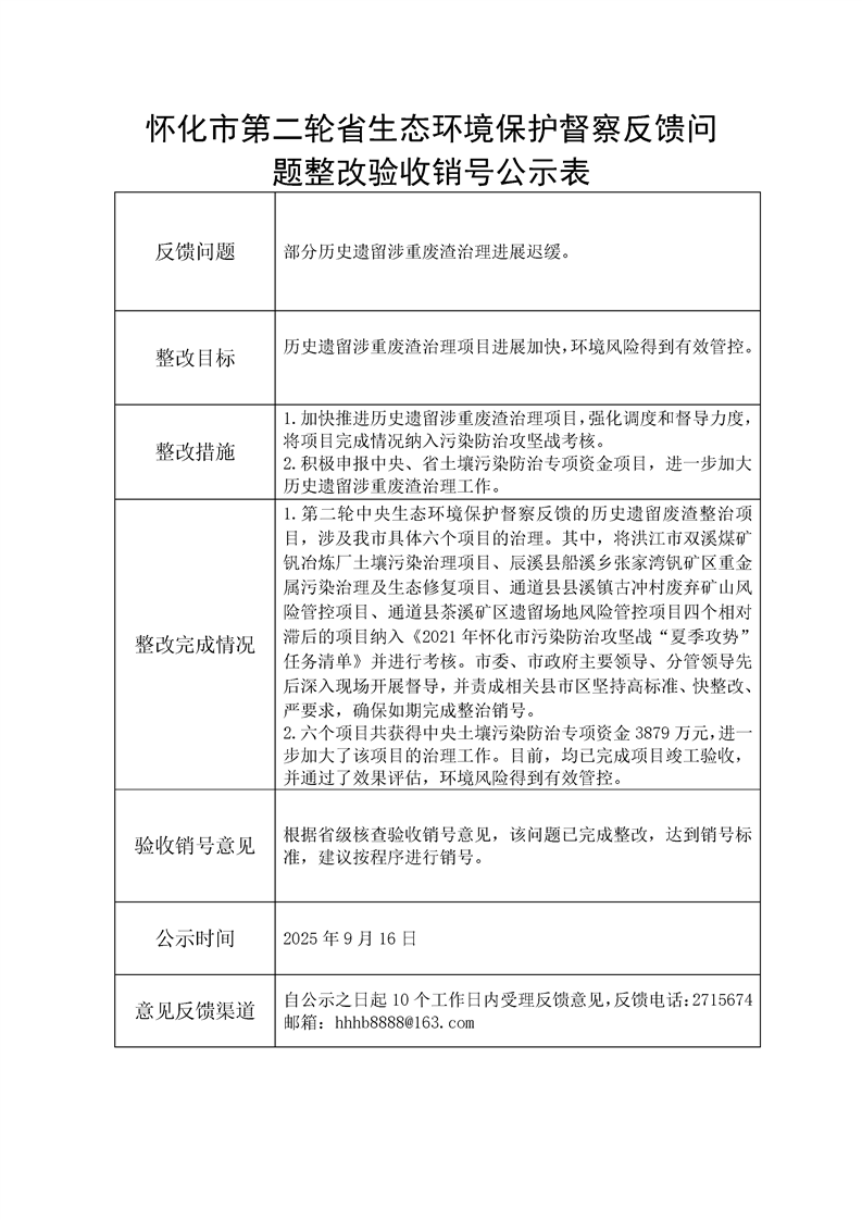 懷化市第二輪省生態(tài)環(huán)境保護(hù)督察反饋問(wèn)題整改驗(yàn)收銷號(hào)公示