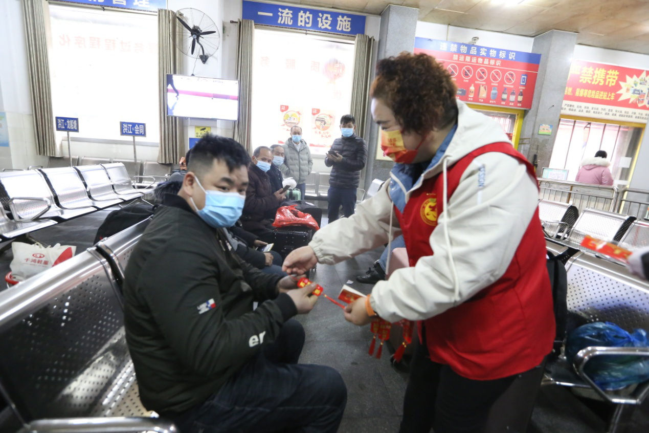 志愿者為春運(yùn)首天首批幸運(yùn)旅客送上專(zhuān)屬福袋和祝福。隨后,志愿者一起為候車(chē)大廳掛燈籠、貼福字,為旅客營(yíng)造濃厚的節(jié)日氛圍,并圍繞重點(diǎn)旅客開(kāi)展搬運(yùn)行李、票務(wù)協(xié)助等志愿服務(wù),做好疫情防控、安全生產(chǎn)等宣傳。(洪江區(qū)春運(yùn)辦
