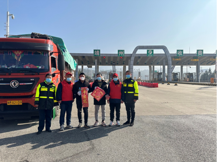 與此同時,在懷化高速公路各收費(fèi)站、服務(wù)區(qū),到處都有身穿紅馬甲、投到小紅帽的“路燈”志愿者在人群車流中來回穿梭的身影,新春“福”字、暖心姜茶、引導(dǎo)指路、發(fā)放口罩……一幕幕溫馨的畫面正在四處上演。“剛回到家鄉(xiāng)就收到這么大個‘?!郑履暌欢ê眠\(yùn)連連?!痹诰钢菔召M(fèi)站出口,周師傅領(lǐng)到一個大“?!弊珠_心地說。