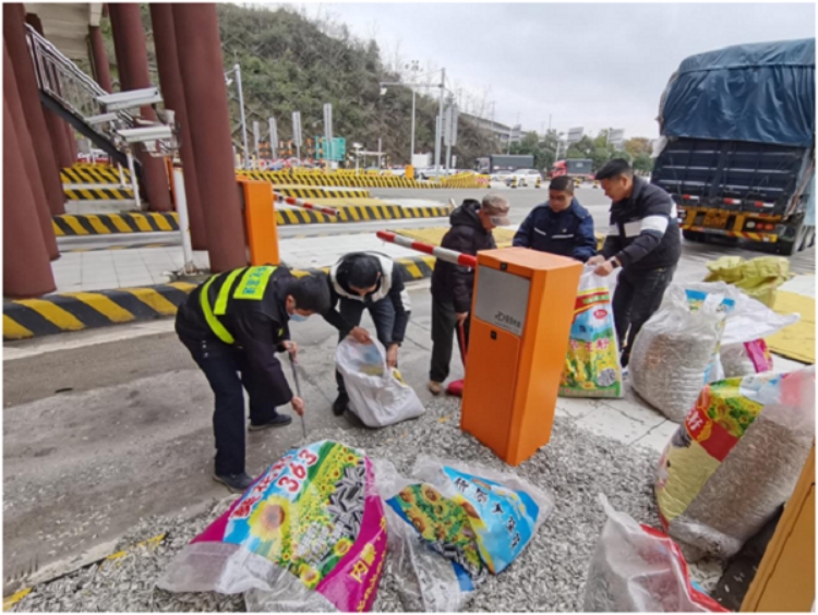貨車經(jīng)過懷化南收費站時,車上瓜子大量傾瀉,收費班長周明生組織人員幫忙清理。