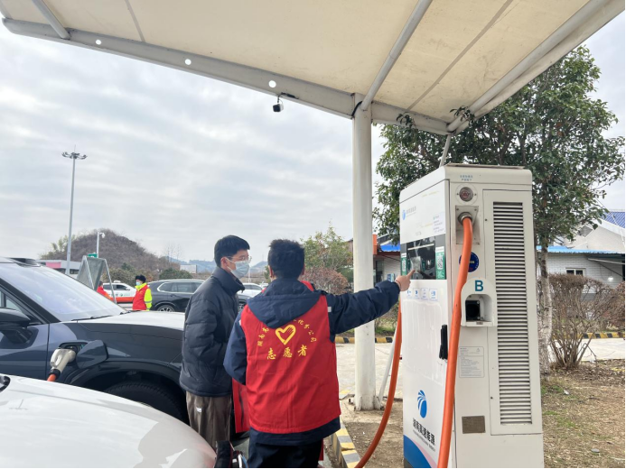 大年初三,外出旅游獲探親訪友的車輛越來越多,考慮到許多司乘人員對充電樁使用生疏,為更好服務(wù)司乘朋友,縮短排隊充電時間,新晃片區(qū)管理所“路燈”志愿者們一早來到新晃服務(wù)區(qū),在電動車充電樁處設(shè)置服務(wù)臺,對前來充電的司乘人員進(jìn)行教學(xué)示范,保障其快速充電,并送上新年祝福。
