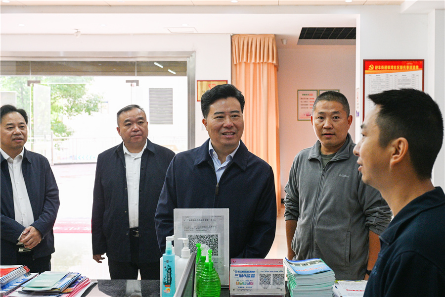 (10月9日上午,市委副書記、市長黎春秋以“四不兩直”方式在鶴城區(qū)督導(dǎo)檢查“一迎三創(chuàng)”工作。圖為黎春秋在迎豐街道銀灣社區(qū)檢查。懷化日?qǐng)?bào)全媒體記者 潘雨 攝)