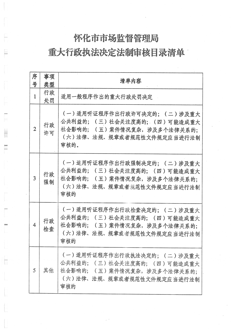 懷化市市場(chǎng)監(jiān)督管理局重大行政執(zhí)法決定法制審核目錄清單