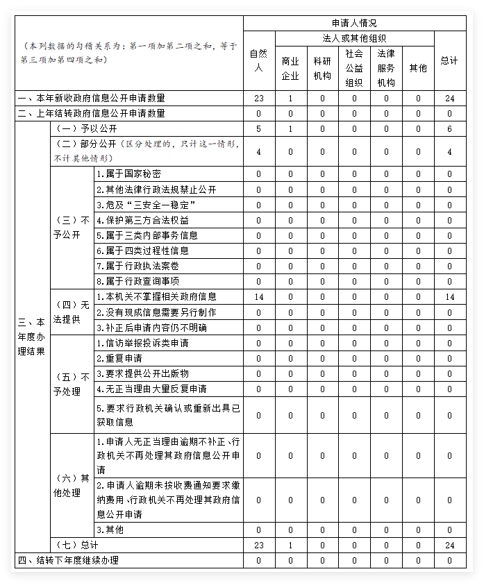 本年度報告根據(jù)《中華人民共和國政府信息公開條例》(以下簡稱《條例》)、湖南省政務(wù)公開領(lǐng)導(dǎo)小組辦公室《關(guān)于貫徹落實(中華人民共和國政府信息公開條例)實施方案》(以下簡稱《實施方案》)及《懷化市政府信息公開實施細則》(以下簡稱《細則》)的有關(guān)規(guī)定,由鶴城區(qū)政務(wù)公開領(lǐng)導(dǎo)小組辦公室編制。全文由總體情況、主動公開政府信息情況、收到和處理政府信息公開申請情況、政府信息公開行政復(fù)議行政訴訟情況、存在的主要問題及改進措施、其他需要報告的事項等六部分組成。本報告的統(tǒng)計數(shù)據(jù)時限為2024年1月1日至12月31日,通過懷化市鶴城區(qū)人民政府門戶網(wǎng)站對外公布。如對報告有任何疑問、意見,請與懷化市鶴城區(qū)政務(wù)服務(wù)中心聯(lián)系(地址:懷化市鶴城區(qū)政務(wù)服務(wù)中心五樓501室,郵編:418000,電話:0745-2338221,電子郵箱:hcqzwzx@126.com)。